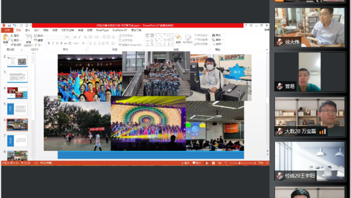 数学201班主任贺茜君老师向大家介绍本班的学习状况,展示了班级的成长过程和数学专业的发展方向。数学202班主任王家赠老师作为授课老师指出,数学不同于其他学科,是一门难度大、分支多的基础学科,考研竞争力极大,并分析了数学专业员工的学习情况。王老师希望大家理性分析自身情况,结合实际定位考研院校。大数20班主任李阳老师从同学们日常丰富多彩的生活介绍了本班班级工作,针对班级整体绩点和四六级考试情况,勉励大家要把功夫下在平时,期末才能更加有的放矢。号召成绩下游同学不掉队,中游同学持续发力。经统20班主任罗玉波老师介绍了经统20班的整体情况:平均绩点名列前茅,同学们积极向上,团结友爱,在志愿活动中实现自我价值,在各种活动中展现风采,并获得2021校级优秀班集体荣誉称号。引用习总书记的一番话鼓励大家再接再厉,学习上更进一步,班集体取得更大荣誉。中外20班主任张伟老师展示了班级上学期取得的优异成绩,希望大家在疫情期间,跟紧老师的脚步;积极参加体育运动;脚踏实地,努力实现梦想。