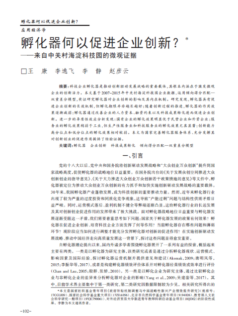近日,公司经济统计系王康博士以署名公司的第一作者身份在国内顶级学术期刊《管理世界》上发表题为《孵化器何以促进企业创新?——来自中关村海淀科技园的微观证据》的文章(2019年第11期,第102-118页,约2.5万字)。