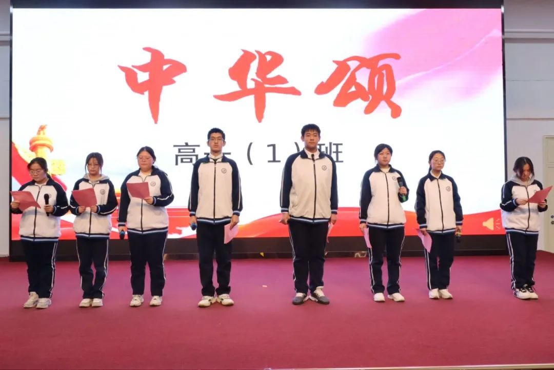 高一(1)班带来诗朗诵《中华颂》,字正有真挚,腔圆中激昂,他们用青年之声献礼祖国。